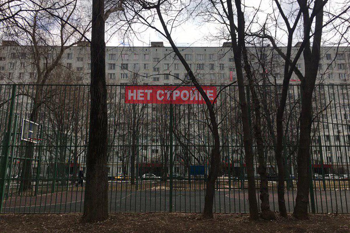 Дом номер семь на улице Цандера расположен между ВДНХ и телецентром Останкино. Во дворе дома — большой сквер, спортивная площадка и несколько лавочек. На яблонях и березах уже больше месяца висят примотанные скотчем объявления «Деревья охраняются жителями от незаконной вырубки», «Нет экологическому вредительству» и «Говорите — вас услышат!» с изображением Путина. На некоторых деревьях краской написано «ошиповано». С балконов и окон дома номер семь и нескольких соседних на сквер смотрят красные и зеленые баннеры «Нет стройке!». В окнах первых и вторых этажей можно увидеть листки A4 со словами «Двор-детям!».