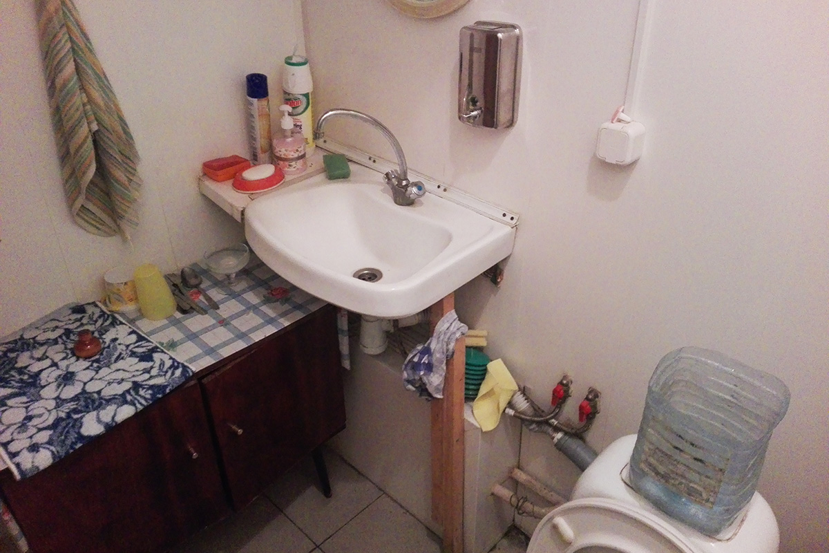 По сравнению с московскими судами в городском суде Коломны приставы были еще более неприветливы: реагировали как на чужаков, хотели сначала ограничить зрителей заседания шестью людьми и сходу запретили журналистам снимать. А снять там было что. Говорят, что об уровне культуры судят по туалетам, так вот в Коломенском суде вас ждет «система-ниппель» из пластикой бутылки вместо нормального бачка для унитаза и почему-то расставленные там же столовые приборы сотрудников суда.
